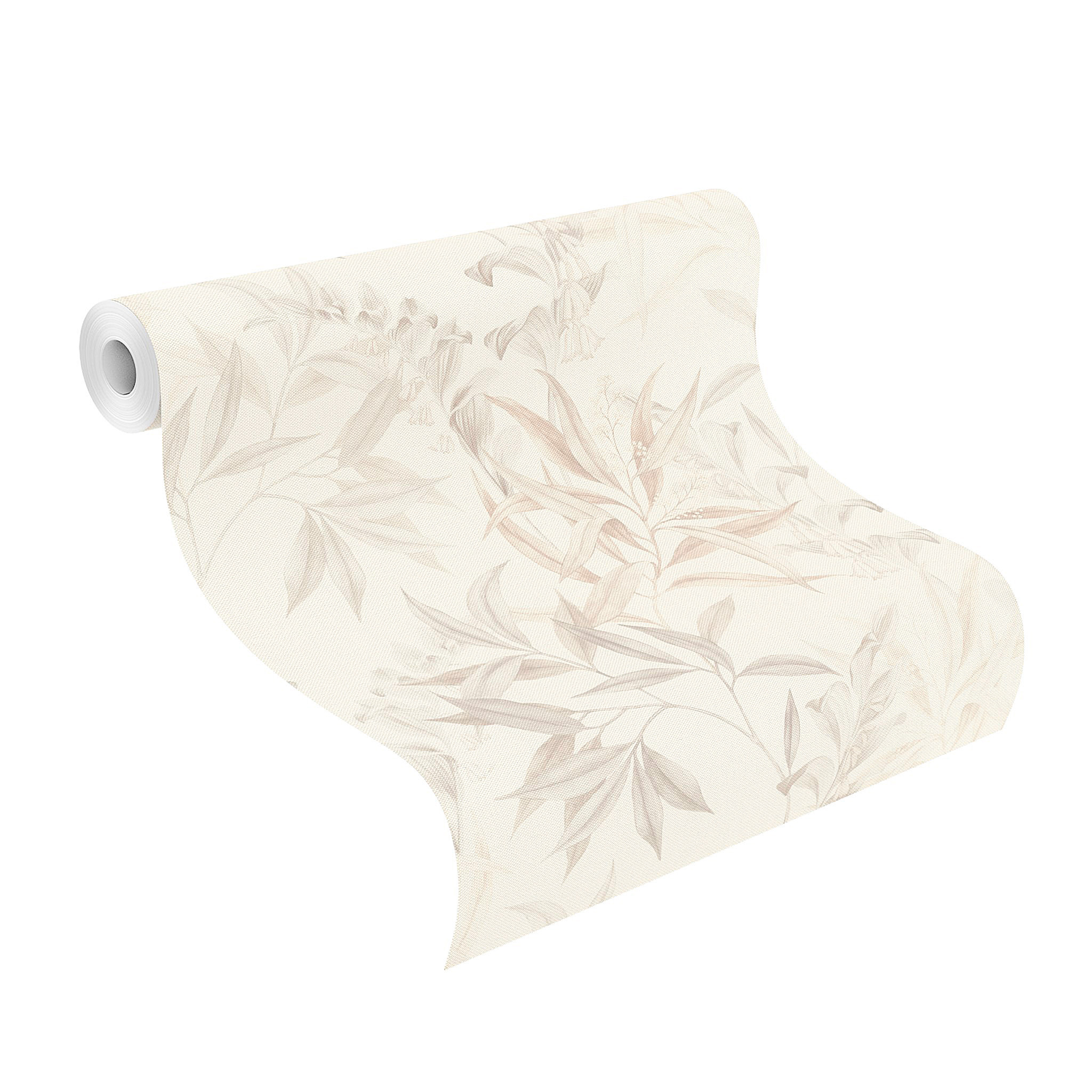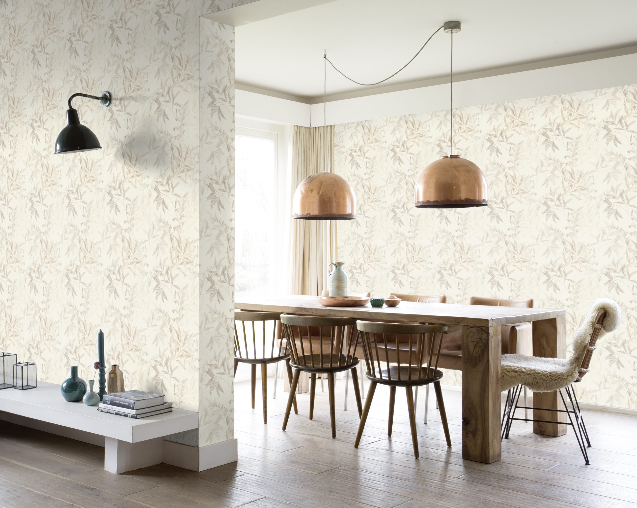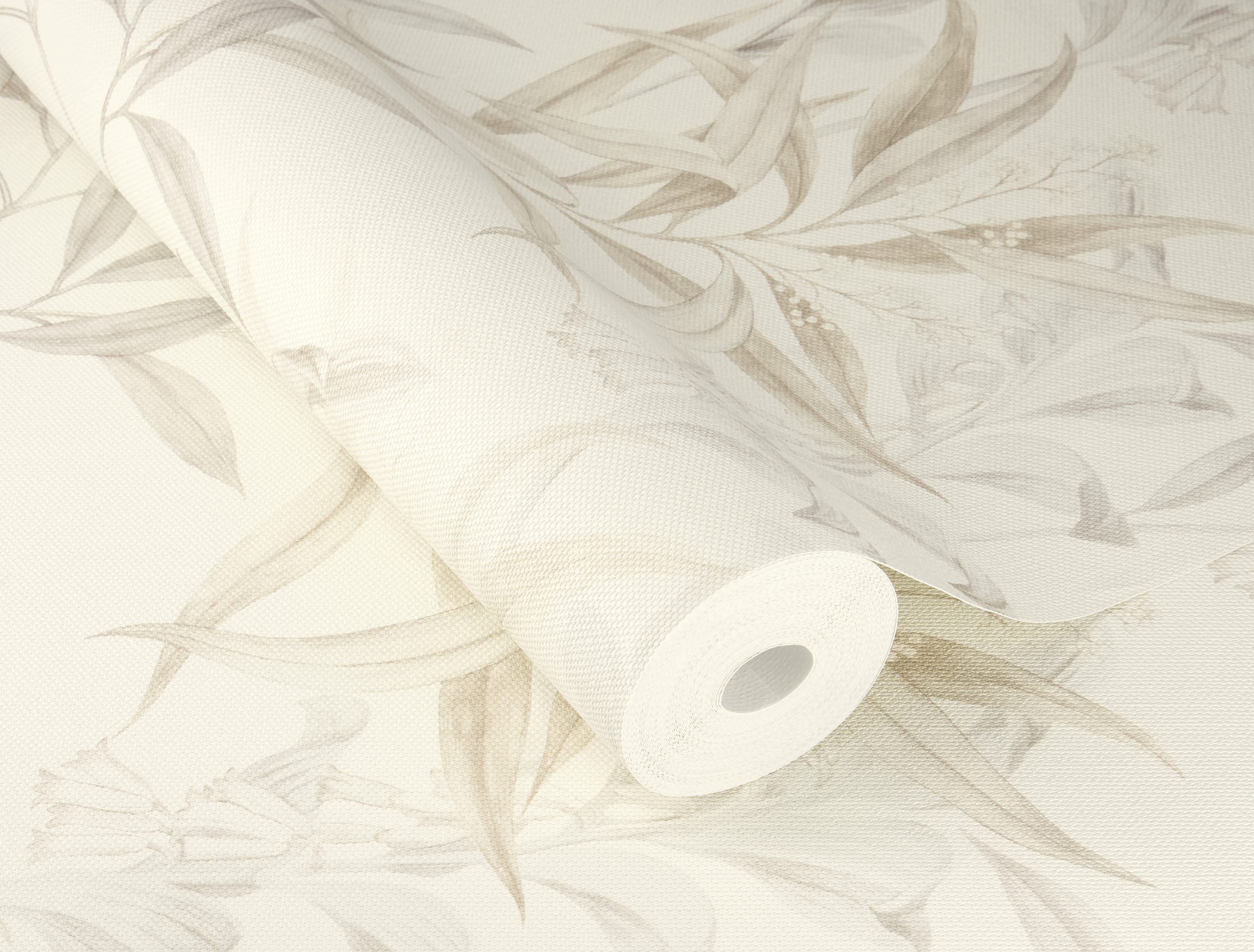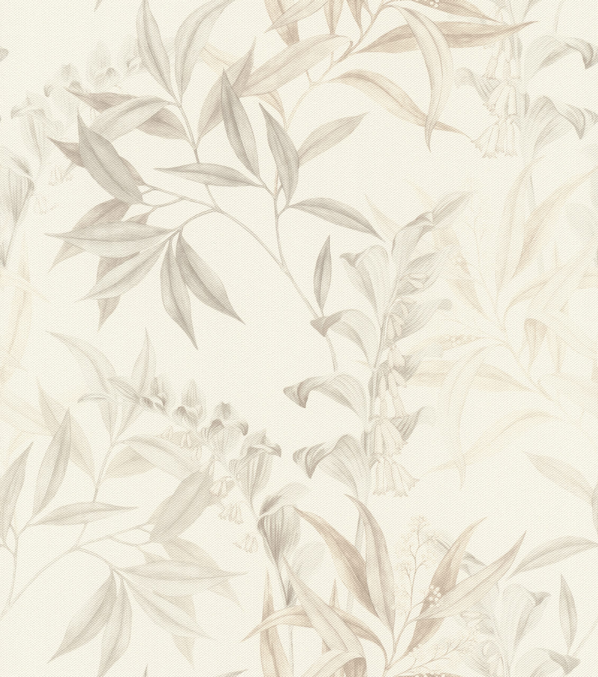 Papel mural con un delicado estampado con elegantes hojas y flores acampanadas con efecto acuarela.
