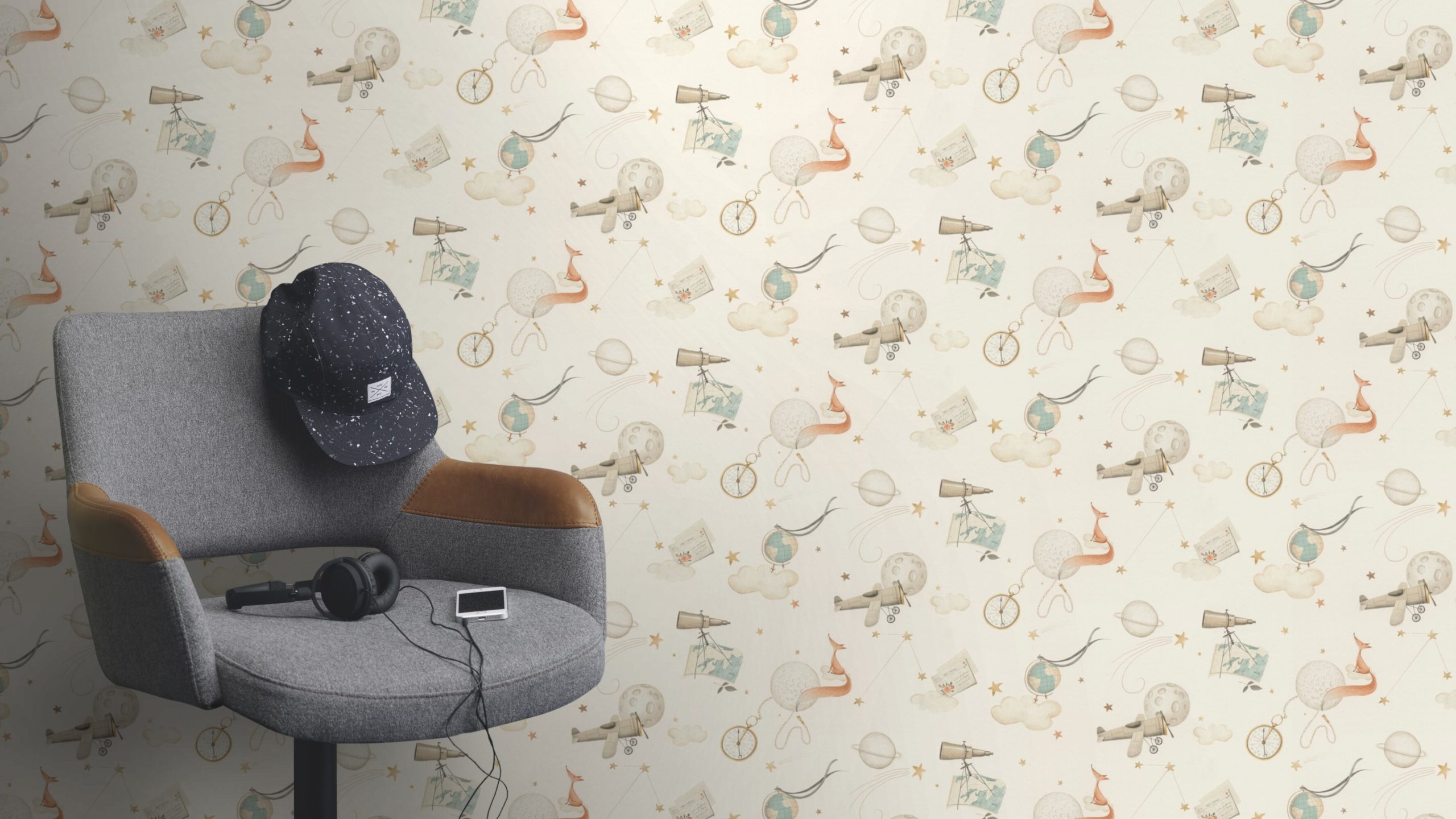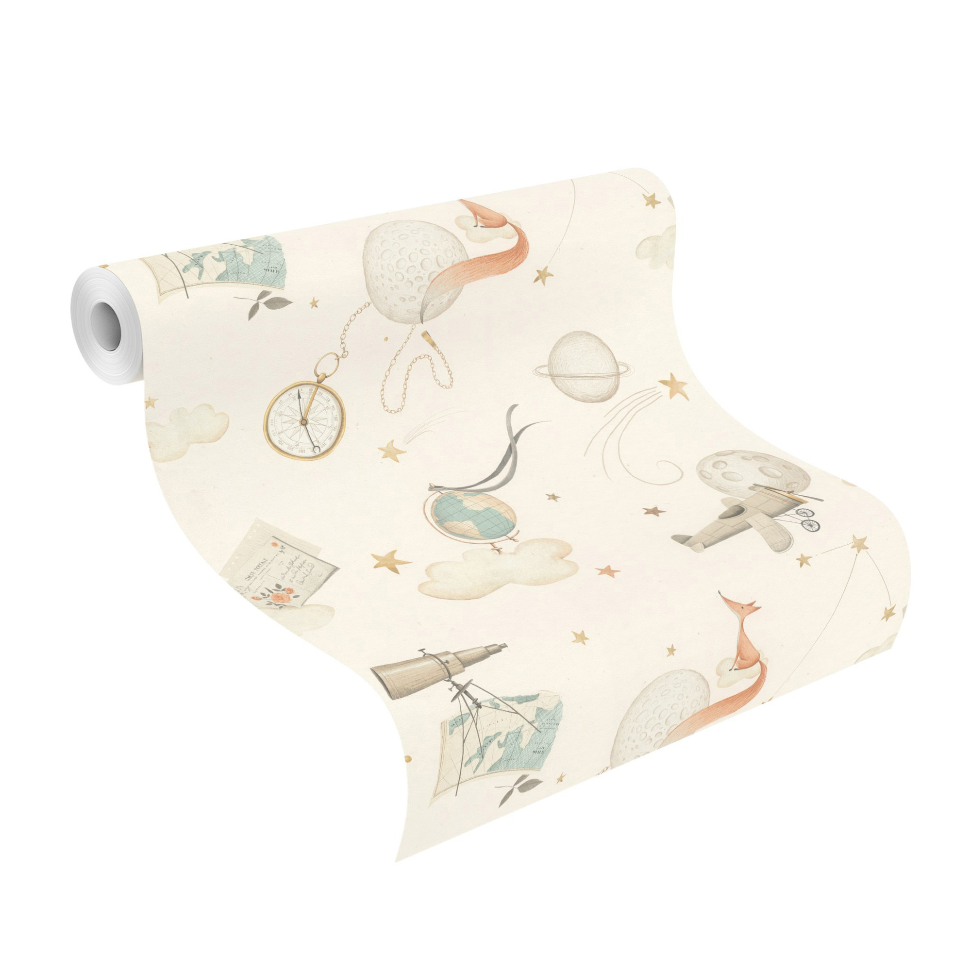 Papel mural diseño infantil… un pequeño zorro sentado en una nube, rodeado de una brújula antigua, un globo terráqueo, binoculares y un mapa antiguo, símbolos de aventura y exploración.