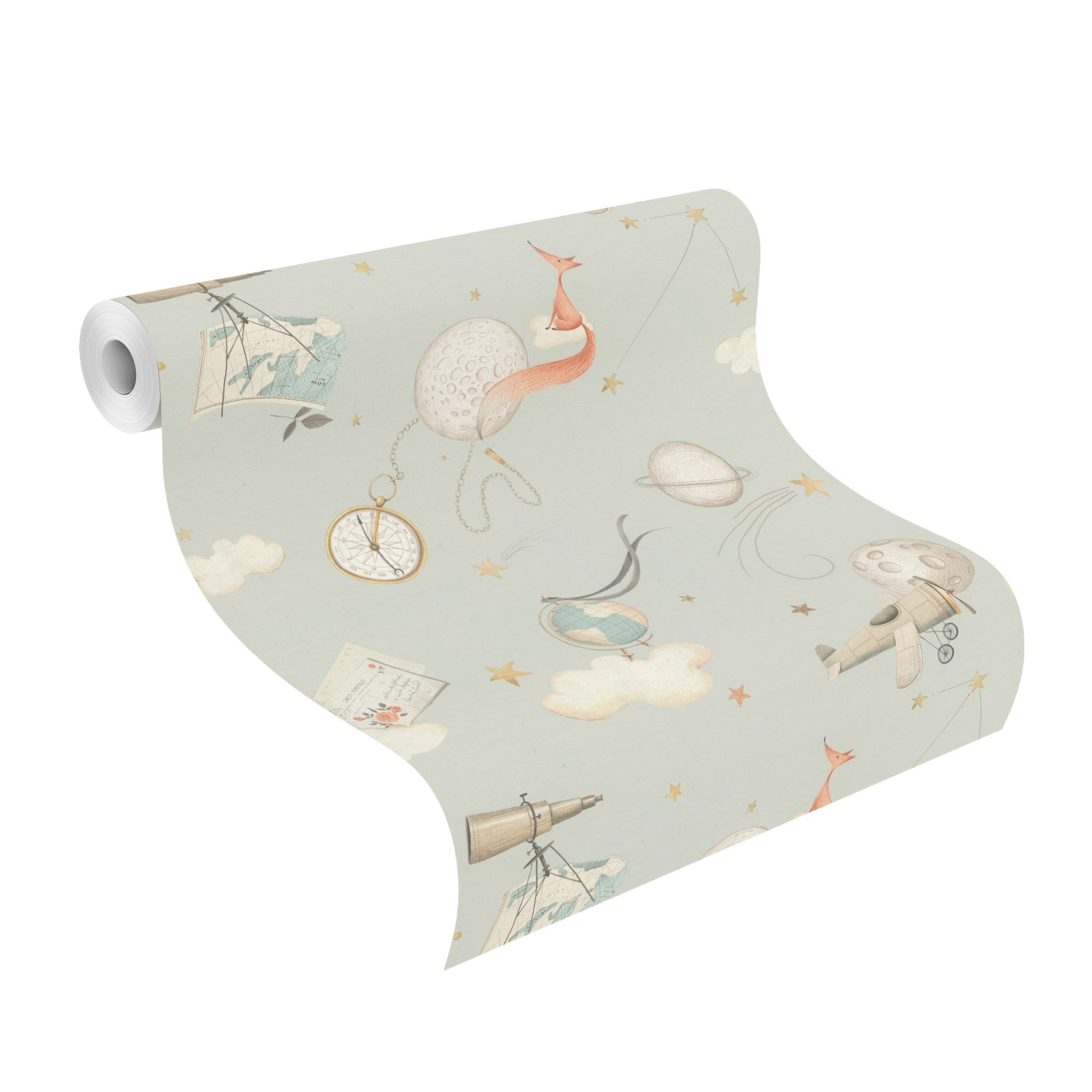 Papel mural diseño infantil… un pequeño zorro sentado en una nube, rodeado de una brújula antigua, un globo terráqueo, binoculares y un mapa antiguo, símbolos de aventura y exploración.