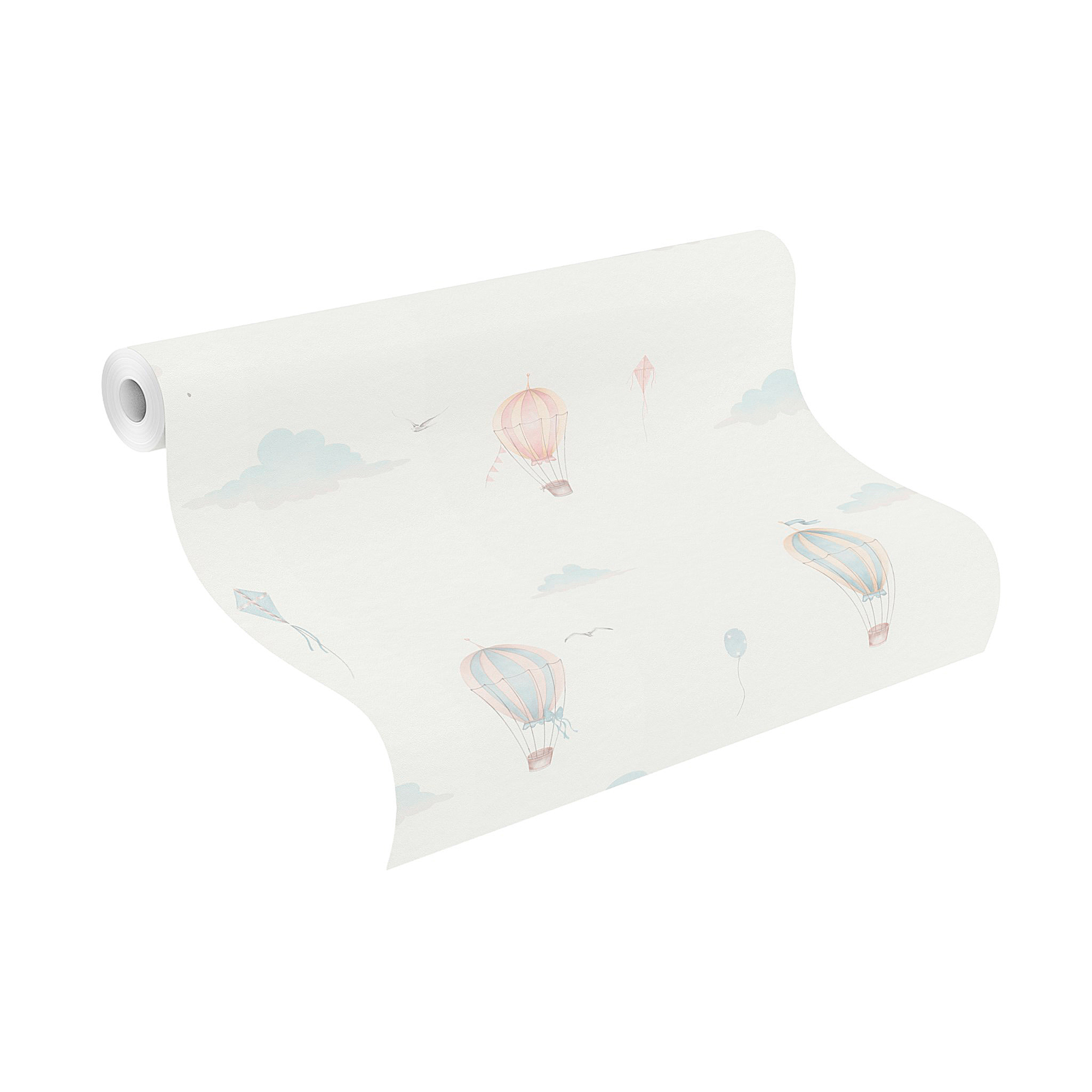 Papel mural diseño infantil con globos aerostáticos de colores pastel flotan plácidamente entre delicadas nubes, pequeños pájaros y globos de colores.