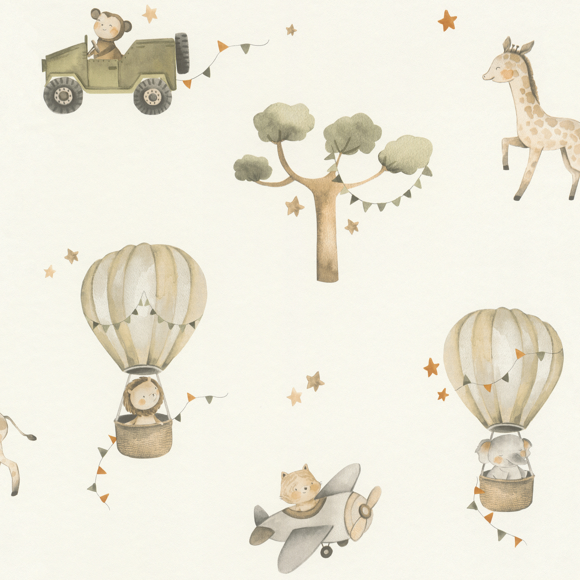 Papel mural diseño infantil de animalitos en aviones, jeep y globos aerostáticos.