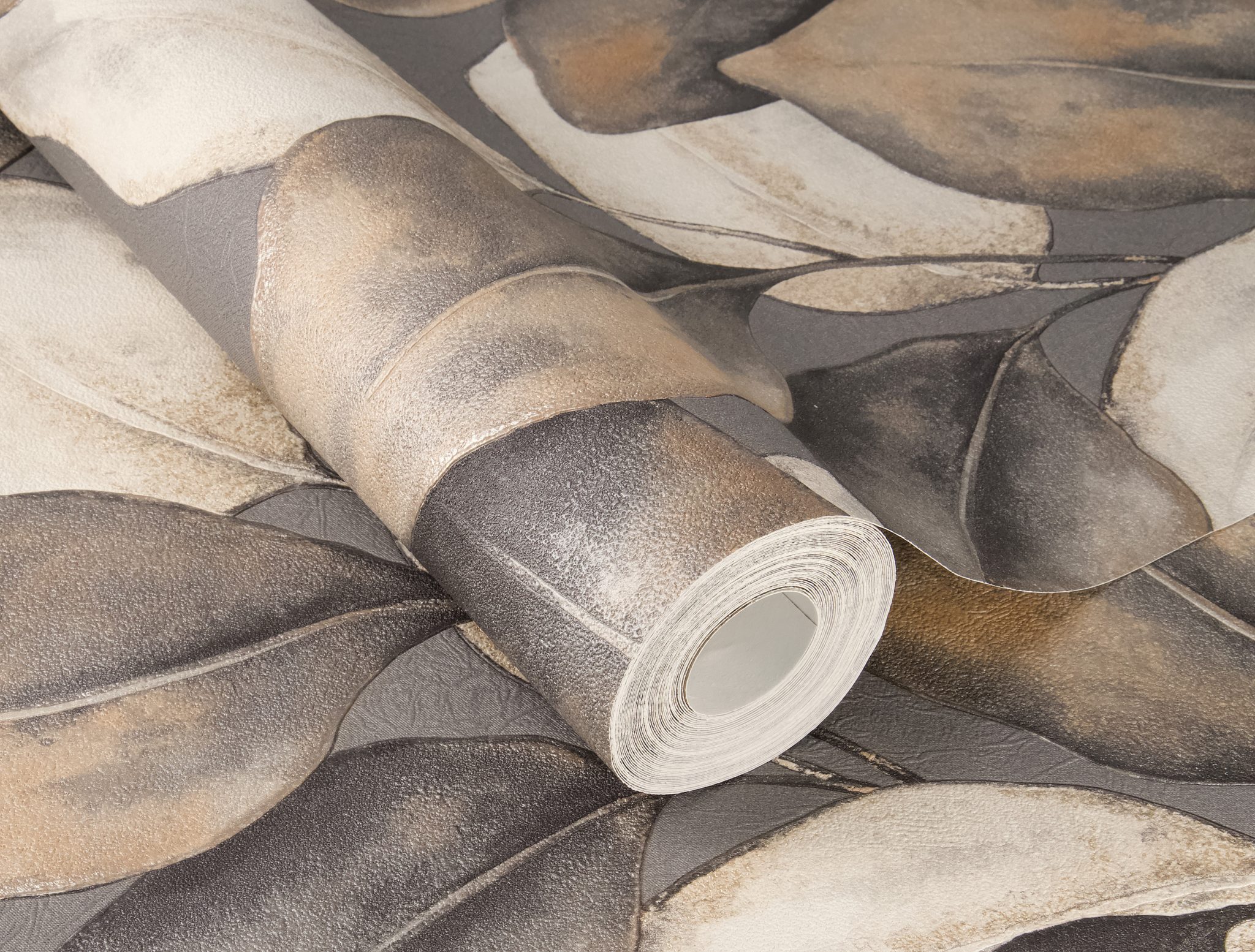 Este papel tiene un diseño de hojas que se entrecruzan, en un fondo blanco oscuro con hojas en tonos café, notas de gris, beige y cobre que lo hacen único.