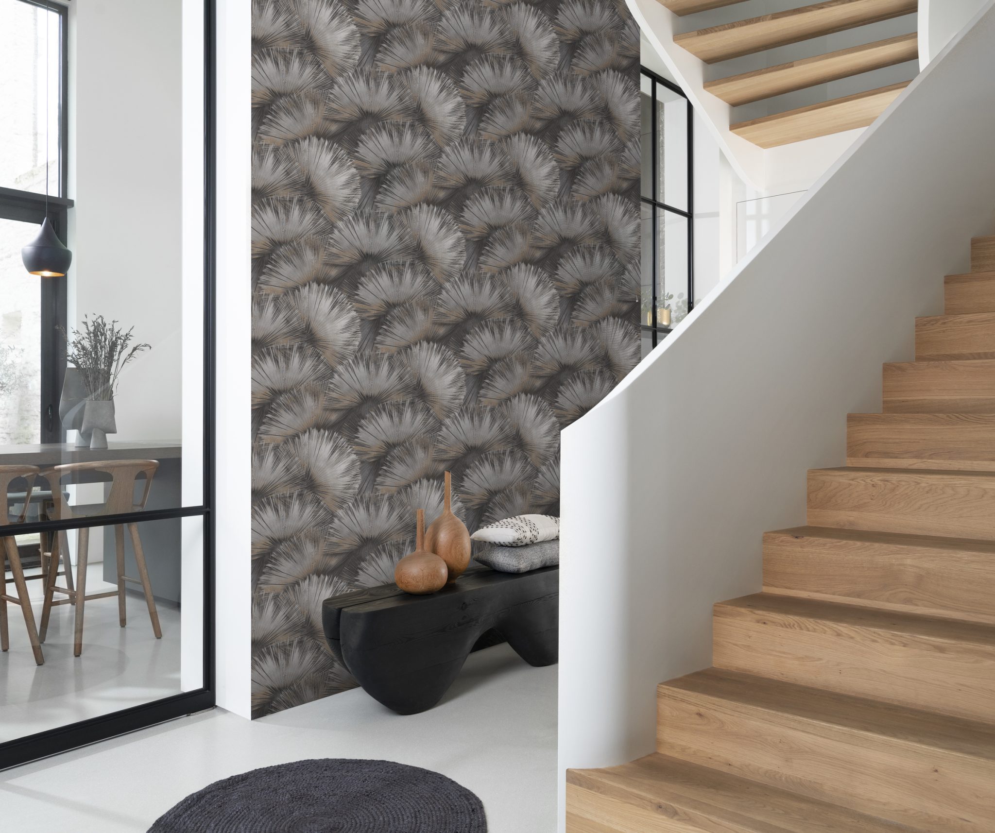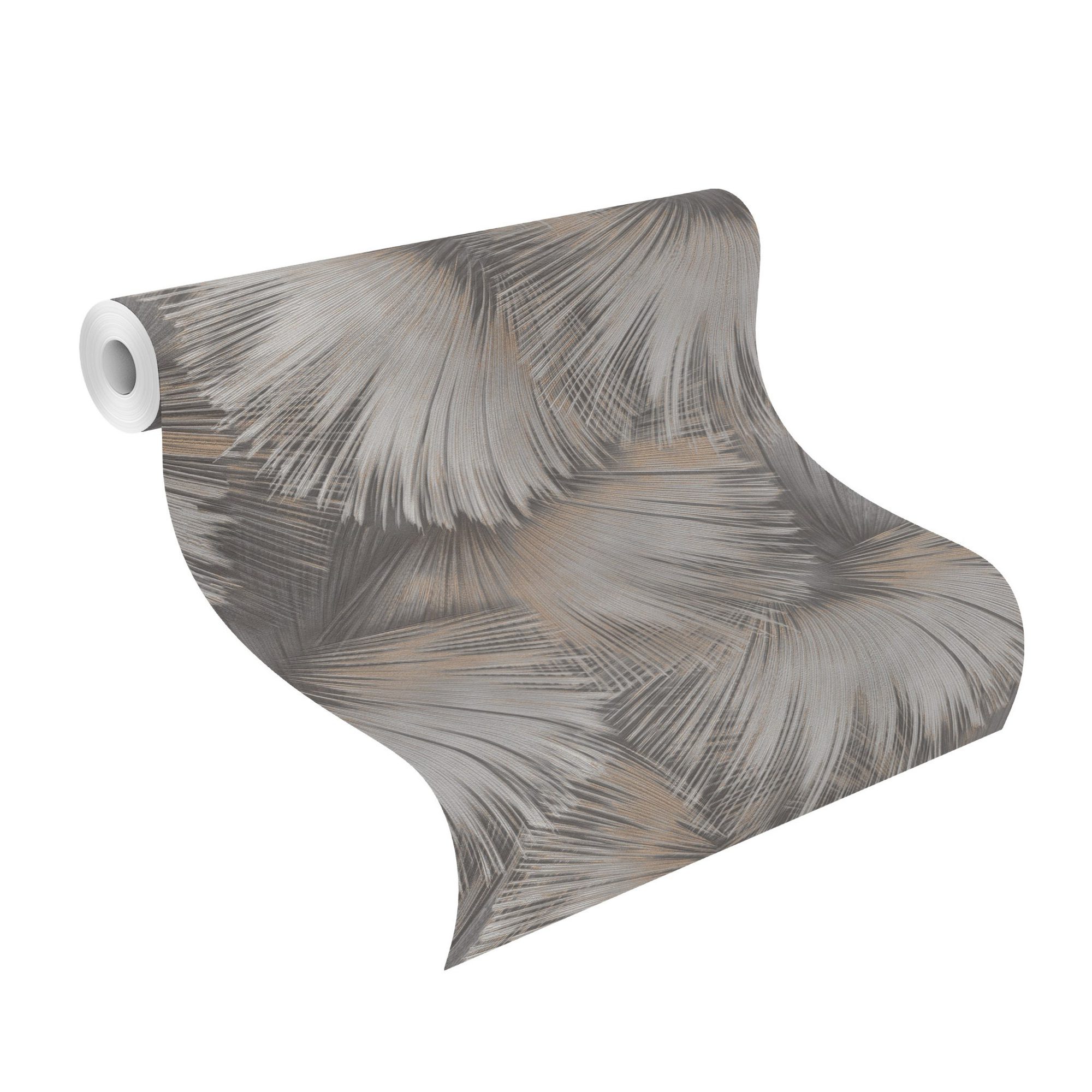 Este papel tiene un diseño de hojas de palma que es como un juego de luz, ya que los colores tienen un sutil brillo dándole un carácter moderno pero sofisticado en colores negro, dorado y cobre.