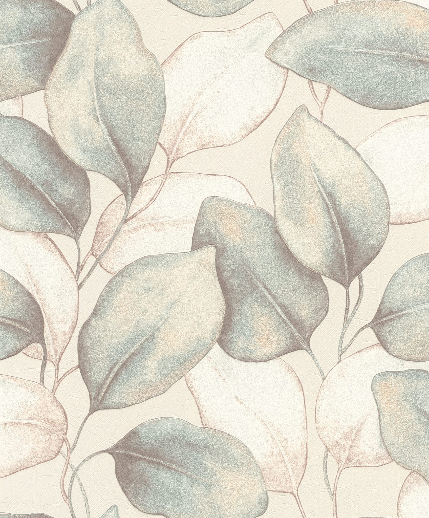 Este papel tiene un diseño de hojas que se entrecruzan, en un fondo blanco crema con hojas verde claro y toques muy sutiles de dorado que lo hacen único.