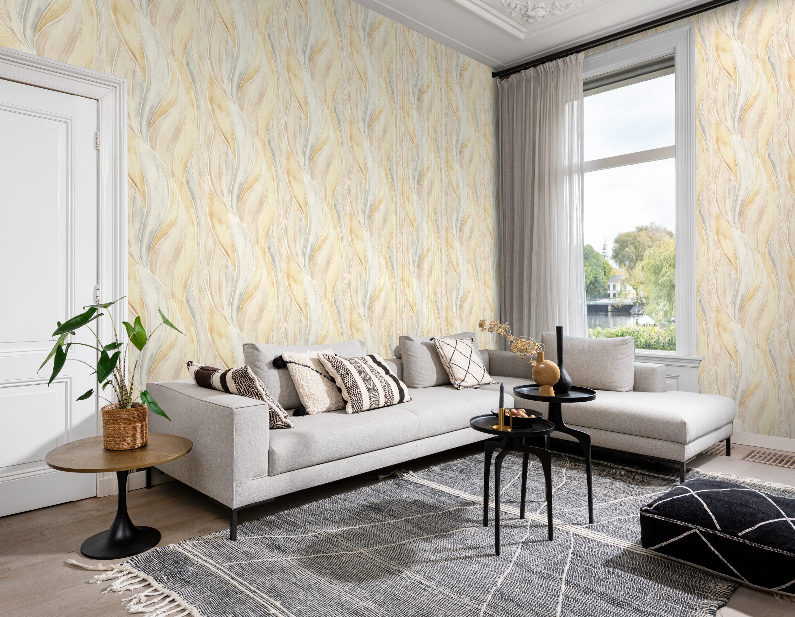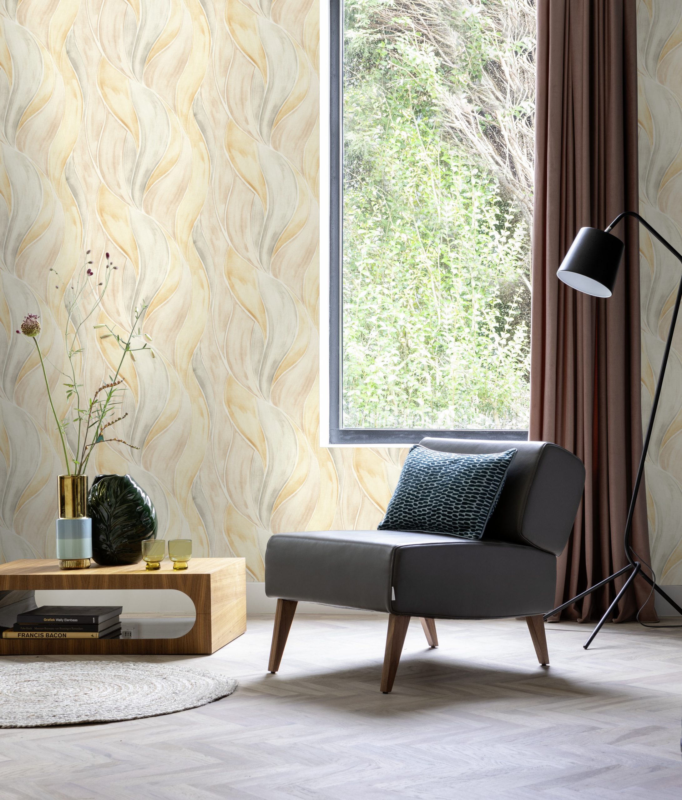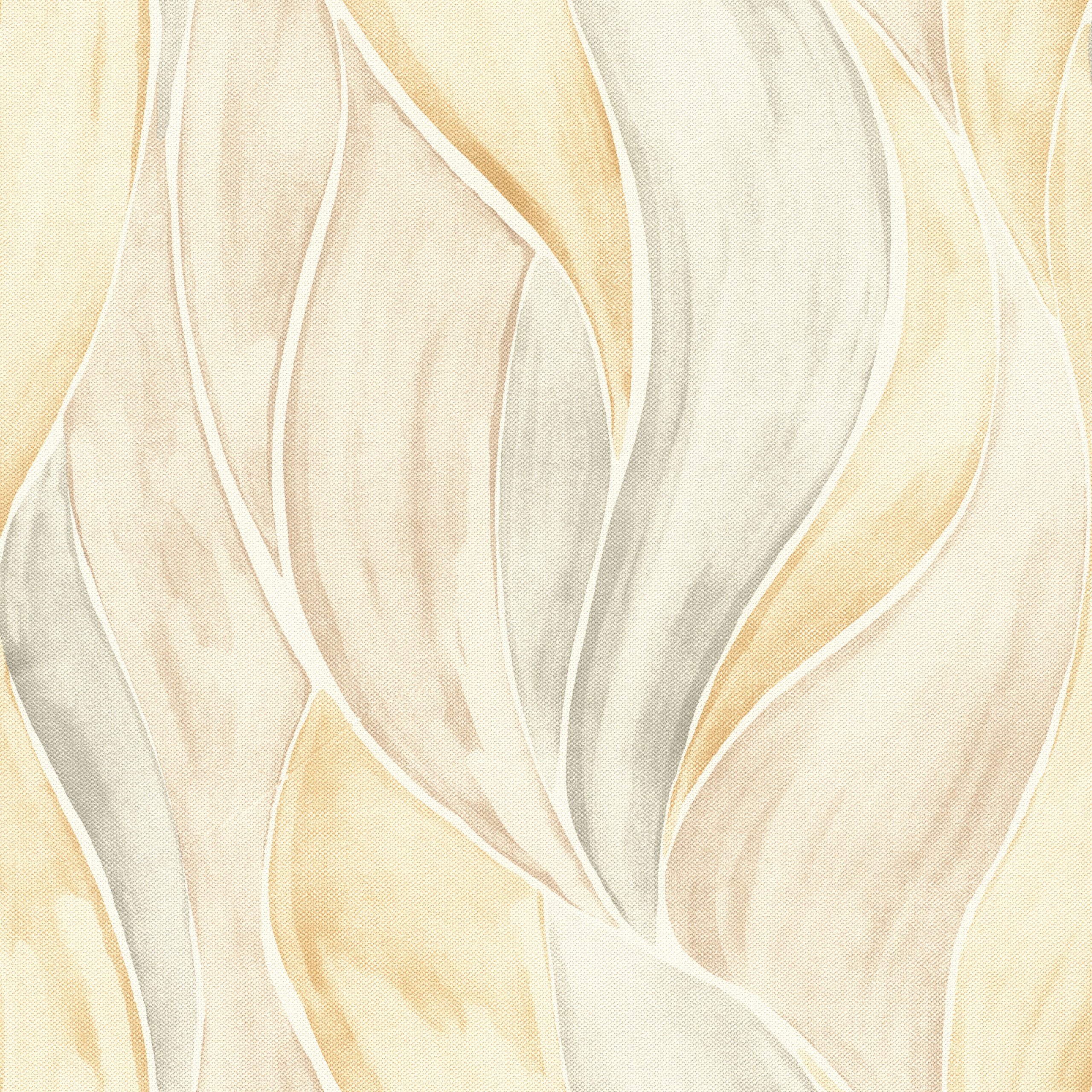 Papel mural con diseño de hojas grandes y curvas generando un efecto de suaves ondas acuareladas.