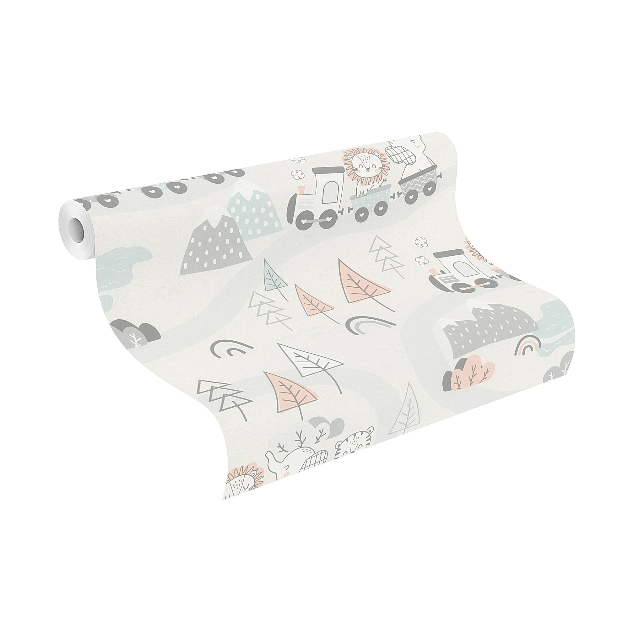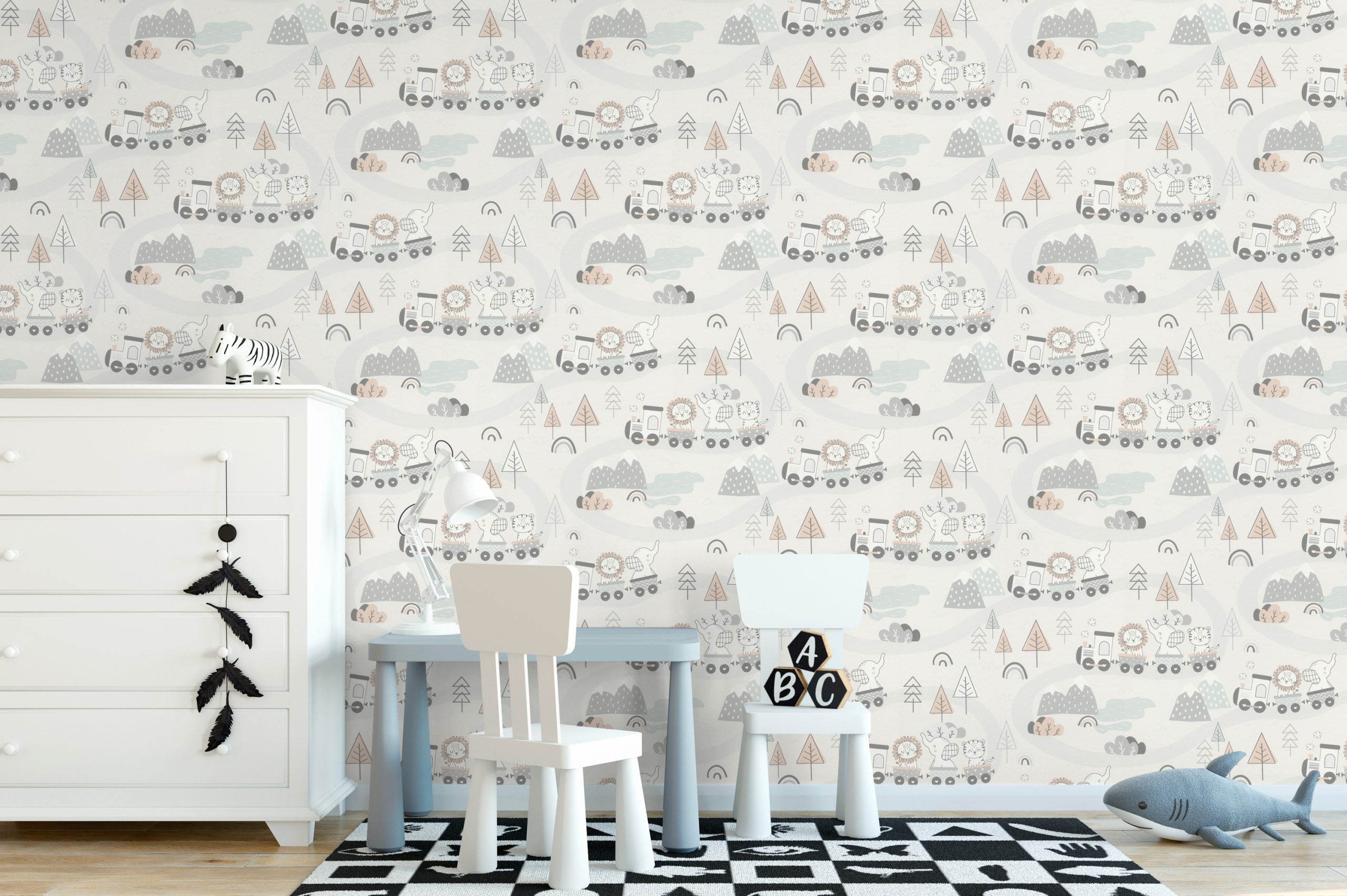 Papel mural diseño infantil con un tren dibujado con cariño y simpáticos animales: un león, un elefante y un tigre, que viajan alegremente por un paisaje encantador con montañas, árboles y arcoíris